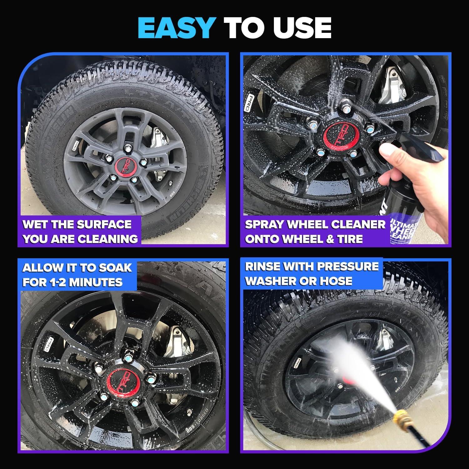 REVOLUTIONARY CLEANING POWER – our wheel and tire cleaner spray quickly dissolves brake dust and road grime. Whether it's your car wheel cleaner or tire cleaner needs, this all-in-one solution ensures your wheels shine like new!